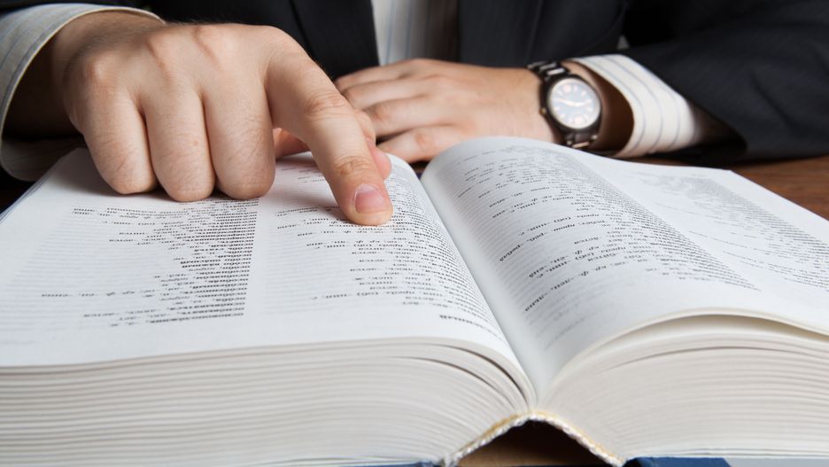 man looking in the large dictionary close up