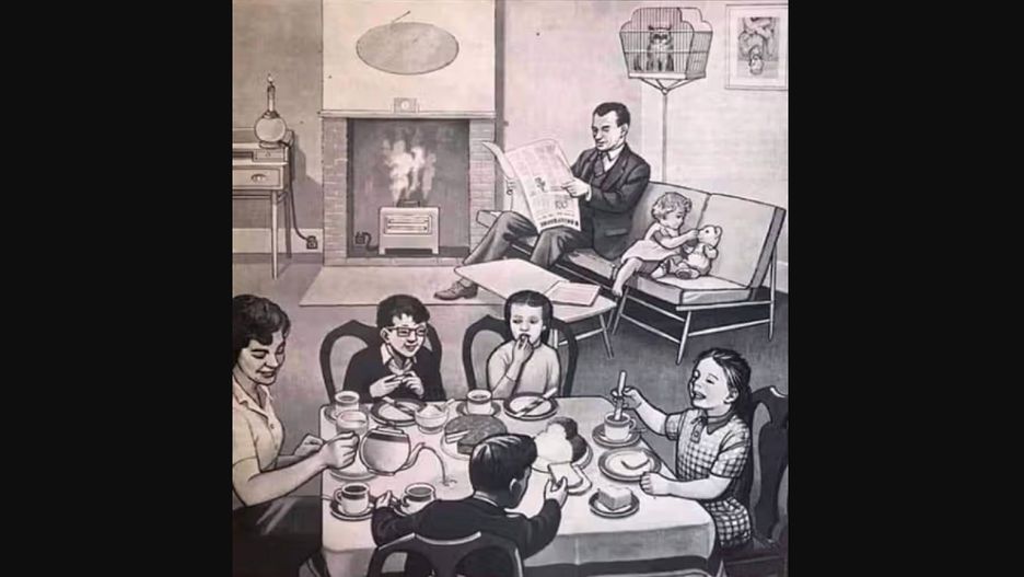 Przyjrzyj się ilustracji. Zobaczysz na niej ojca czytającego gazetę, który wraz z dzieckiem siedzi na kanapie. Matka siedzi przy stole z pozostałą czwórką dzieci, które jedzą posiłek. Co tu się może nie zgadzać?
